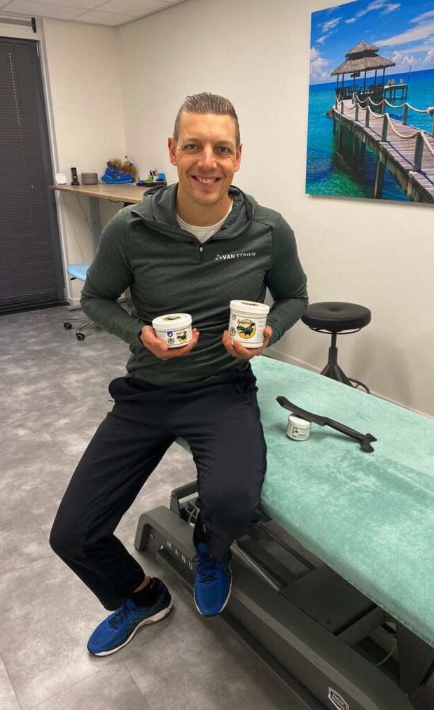 Für effektive Faszienbehandlungen ist ein geeignetes Zwischenmittel mit gutem Griff unverzichtbar. Seit einigen Jahren verwendet Martijn die Massagewachse von Songbird, weil er feststellte, dass andere Produkte zu stark gleiten – was die gezielte Arbeit an den Faszienschichten erschwert.